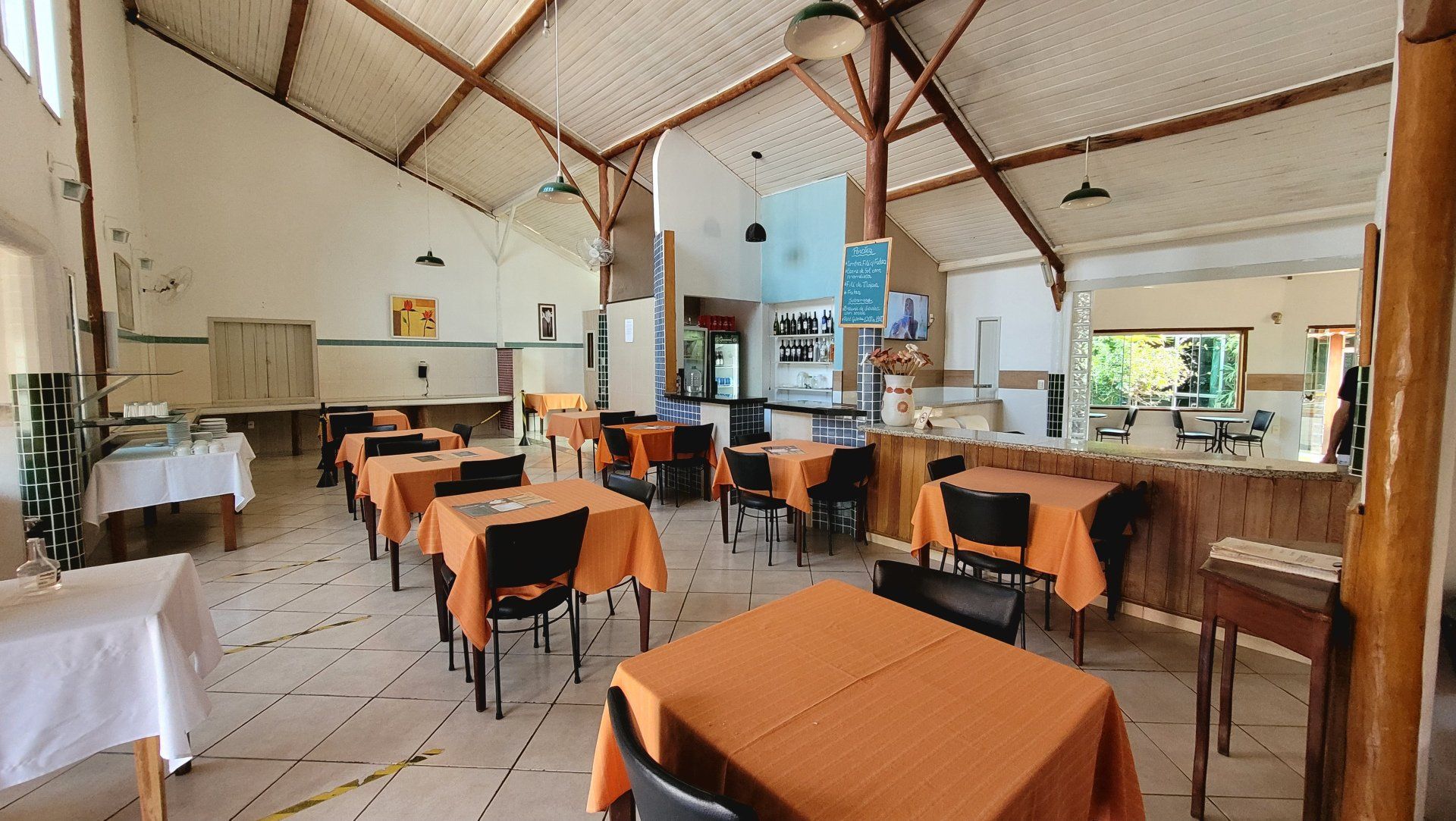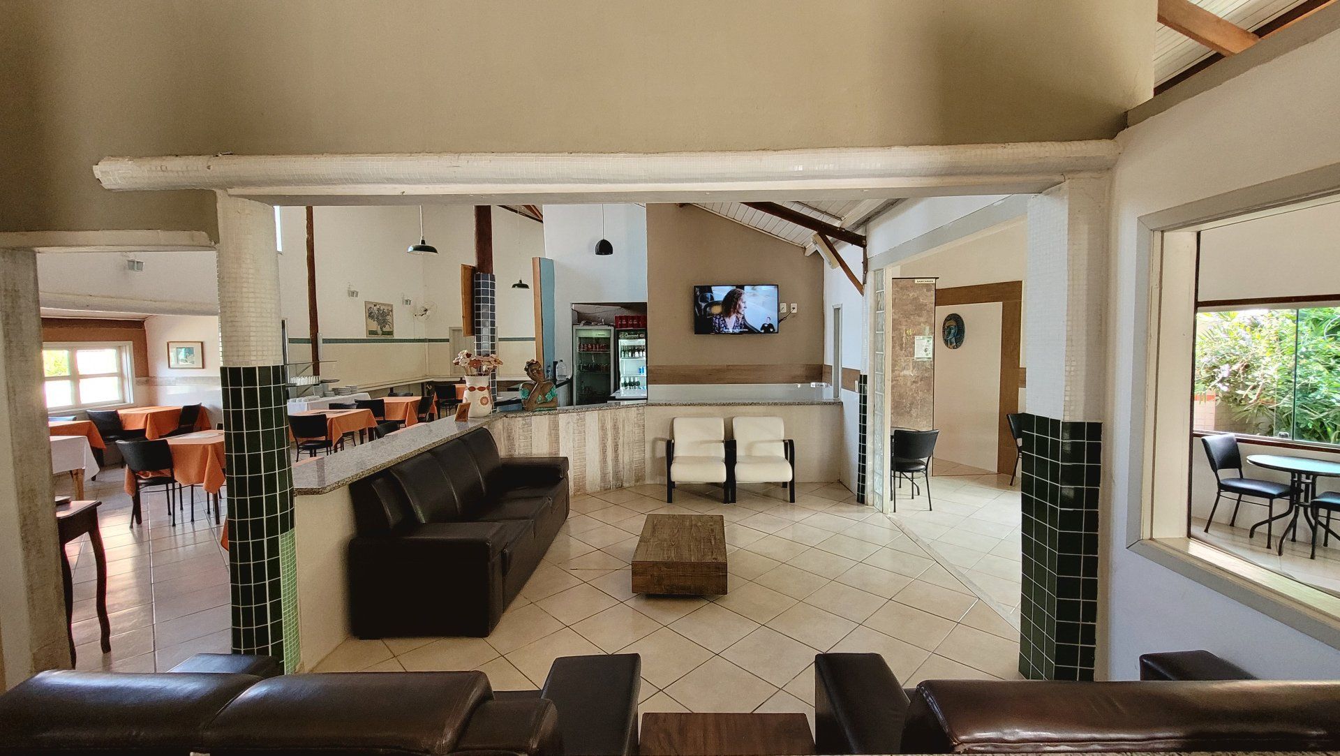 Amplo salão de café da manhã com área de televisão e recepção com scoth bar
